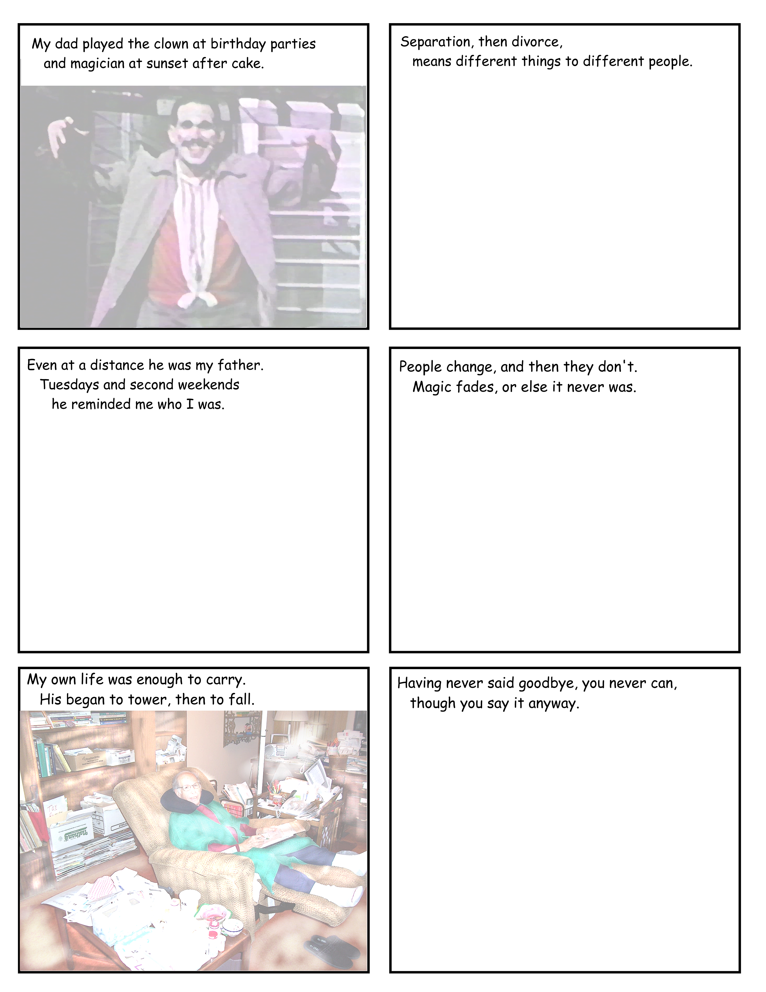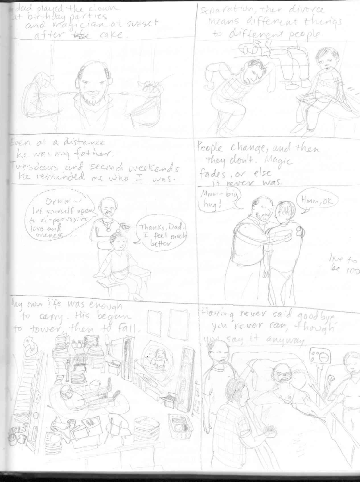 Franzie comes up with great assignments. On the first day of class, he had students brainstorm and then vote on a theme for an assignment for the college comic anthology. The minute we decided on the theme of “Magic,” I knew I wanted it to be about my Dad. Dad was literally into magic when I was little, and dressed up as a clown in whatever he had lying around, like his old Oberlin College sweater and a pajama top, plus greasepaint. He also invested in a set of magic tricks which I used to play with after the divorce, trying not to actually cut off my finger with the rusty blade of the trick finger-guillotine.